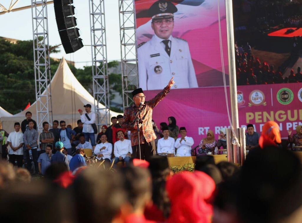 Wali Kota Makassar Danny Pomanto mengukuhkan 5.970 Ketua RT dan Ketua RW di Lapangan Karebosi Makassar, Minggu pagi (27/8). Pelantikan dilakukan usai salat subuh berjamaah di lokasi yang sama. Ketua RT yang akan dikukuhkan kurang lebih 4.972 orang, dan ketua RW sekitar 998 orang. Mereka merupakan perwakilan dari masyarakat hasil dari pemilihan ketua RT/RW serentak (Pilkara), Februari 2017 lalu. (ARI)