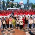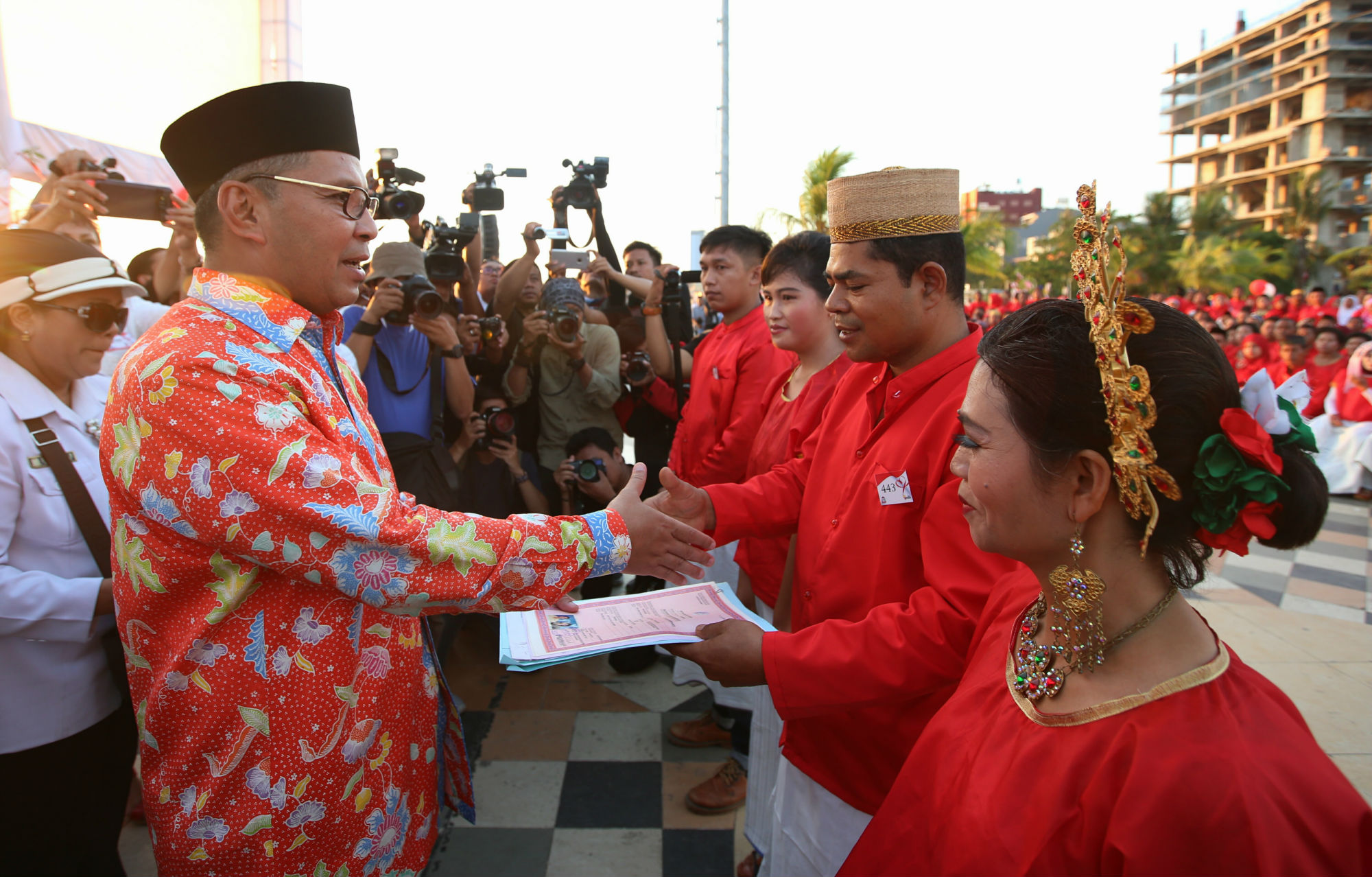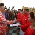 Sebanyak 500 pasangan mengikuti prosesi nikah secara massal di Anjungan Pantai Losari Makassar dalam rangka menyambut peringatan hari ulang tahun kemerdekaan Republik Indonesia, Sabtu (6/8). Para peserta menikah ulang untuk mendapatkan pengesahan hukum dari negara, karena sebelumnya pernah menikah menurut hukum agama. Acara ini merupakan kerja sama Pemerintah Kota Makassar melalui Dinas Sosial, Dinas Kependudukan dan Catatan Sipil, serta Komunitas Peduli Kota Makassar. (Ari)
