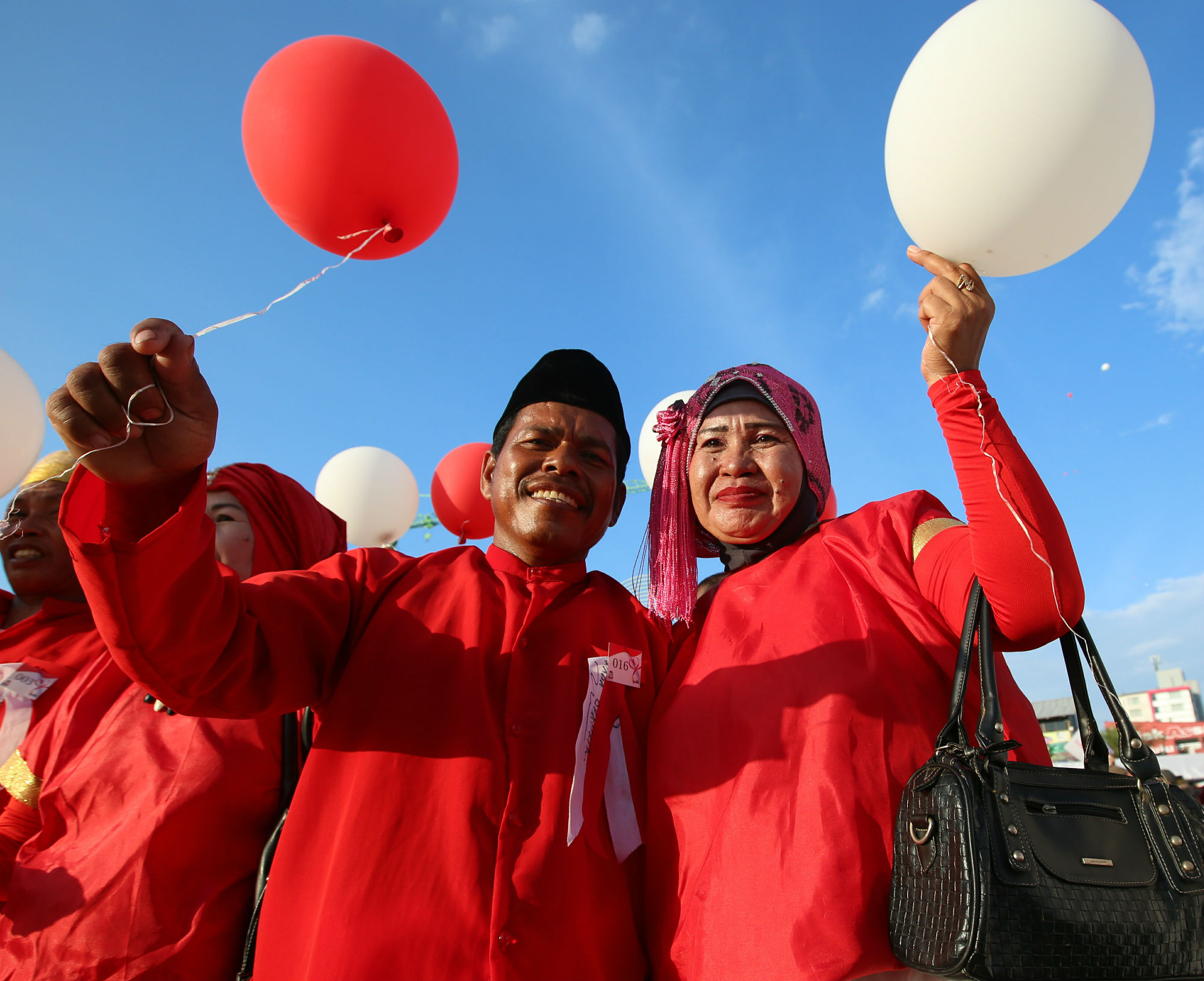 Sebanyak 500 pasangan mengikuti prosesi nikah secara massal di Anjungan Pantai Losari Makassar dalam rangka menyambut peringatan hari ulang tahun kemerdekaan Republik Indonesia, Sabtu (6/8). Para peserta menikah ulang untuk mendapatkan pengesahan hukum dari negara, karena sebelumnya pernah menikah menurut hukum agama. Acara ini merupakan kerja sama Pemerintah Kota Makassar melalui Dinas Sosial, Dinas Kependudukan dan Catatan Sipil, serta Komunitas Peduli Kota Makassar. (Ari)