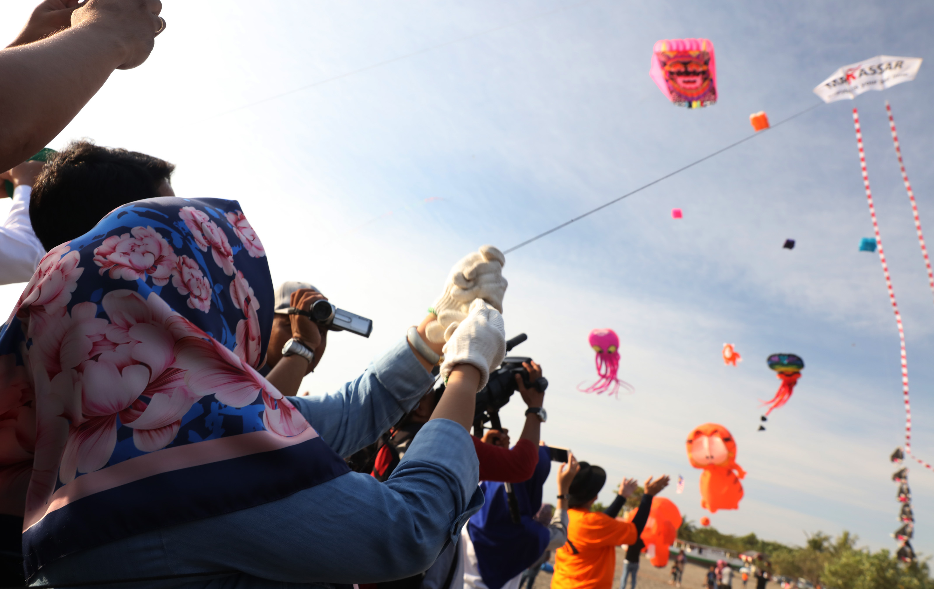 Ratusan pecinta peserta berlomba mempertontonkan keahlian mereka menerbangkan layang-layang, pada Festival Layang-layang di Pantai Akkarena, jalan Metro Tanjung Bunga Makassar, Sabtu (20/8). Beragam layang-layang dengan jenis, bentuk dan ukuran memenuhi langit sepanjang hari. Festival yang digelar Dinas Pariwisata dan Ekonomi Kreatif Kota Makassar itu digelar hingga Minggu (21/8), dan diikuti peserta asal mancanegara seperti Malaysia, Thailand, dan Singapura. (Ari)