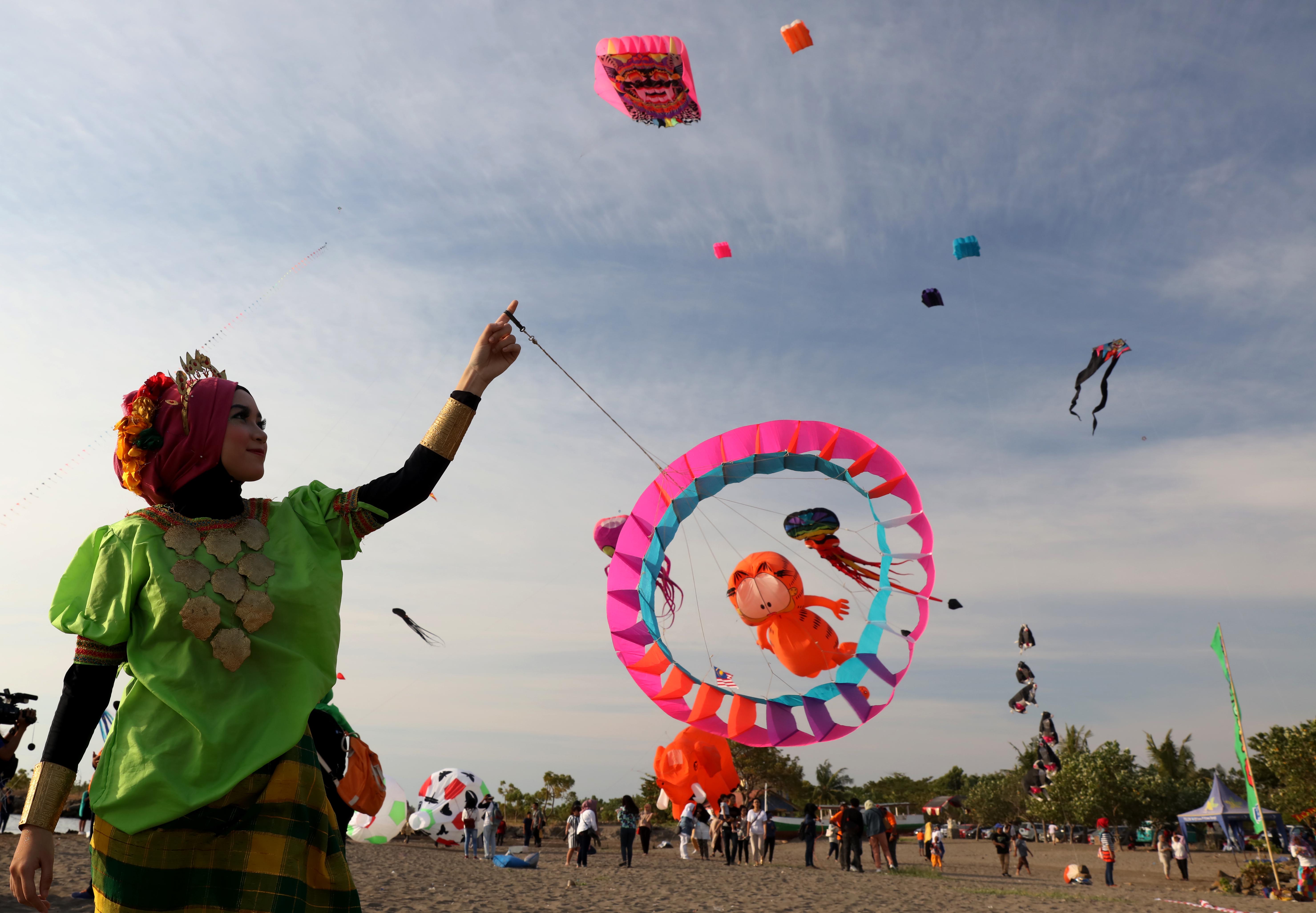 Ratusan pecinta peserta berlomba mempertontonkan keahlian mereka menerbangkan layang-layang, pada Festival Layang-layang di Pantai Akkarena, jalan Metro Tanjung Bunga Makassar, Sabtu (20/8). Beragam layang-layang dengan jenis, bentuk dan ukuran memenuhi langit sepanjang hari. Festival yang digelar Dinas Pariwisata dan Ekonomi Kreatif Kota Makassar itu digelar hingga Minggu (21/8), dan diikuti peserta asal mancanegara seperti Malaysia, Thailand, dan Singapura. (Ari)