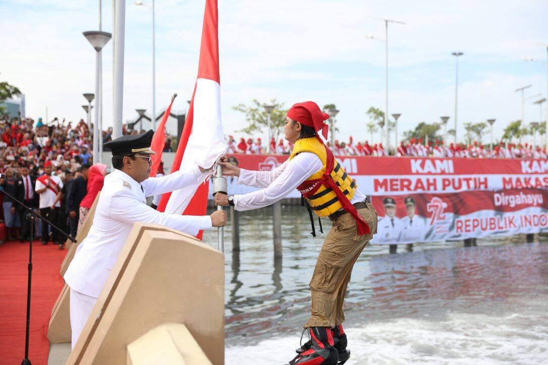 Aksi akrobatik menggunakan peralatan flyboard mewarnai upacara peringatan hari ulang tahun proklamasi kemerdekaan ke-71 Republik Indonesia, yang digelar di Anjungan Pantai Losari Makassar, Kamis (17/8). Dua petugas yang dikawal dengan jetski membawa bendera melayang di atas permukaan air sebelum menancapkannya pada tiang-tiang di atas laut. Formasi tiang yang tertancap di atas laut memiliki simbol 7 dan 2 yang bermakna HUT Kemerdekaan ke-72. Upacara ini diikuti berbagai lapisan masyarakat Makassar. (ARI)