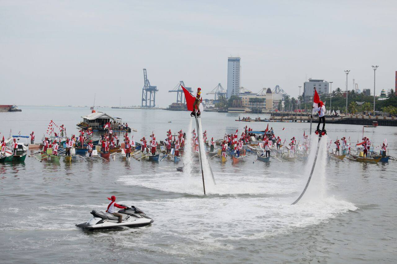 Aksi akrobatik menggunakan peralatan flyboard mewarnai upacara peringatan hari ulang tahun proklamasi kemerdekaan ke-71 Republik Indonesia, yang digelar di Anjungan Pantai Losari Makassar, Kamis (17/8). Dua petugas yang dikawal dengan jetski membawa bendera melayang di atas permukaan air sebelum menancapkannya pada tiang-tiang di atas laut. Formasi tiang yang tertancap di atas laut memiliki simbol 7 dan 2 yang bermakna HUT Kemerdekaan ke-72. Upacara ini diikuti berbagai lapisan masyarakat Makassar. (ARI)