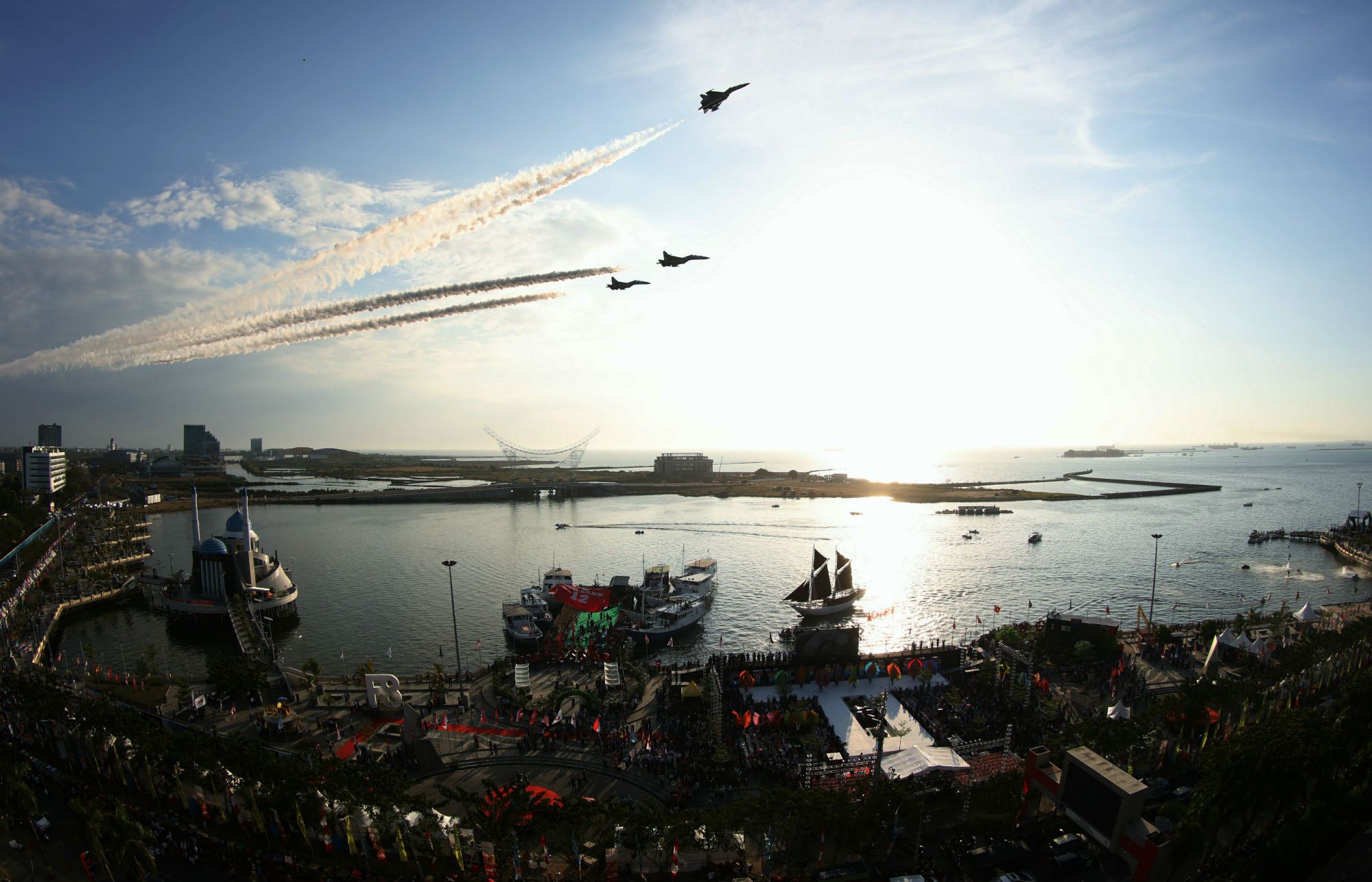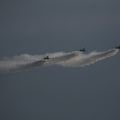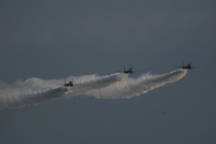 Tiga pesawat jet tempur Sukhoi TNI Angkatan Udara bermanuver saat melintas di atas Anjungan Pantai Losari pada rangkaian upacara pembukaan Makassar International Eight Festival and Forum atau festival F8, Kamis (8/9) petang. Pengunjung festival juga disuguhi atraksi 20 penerjun payung.