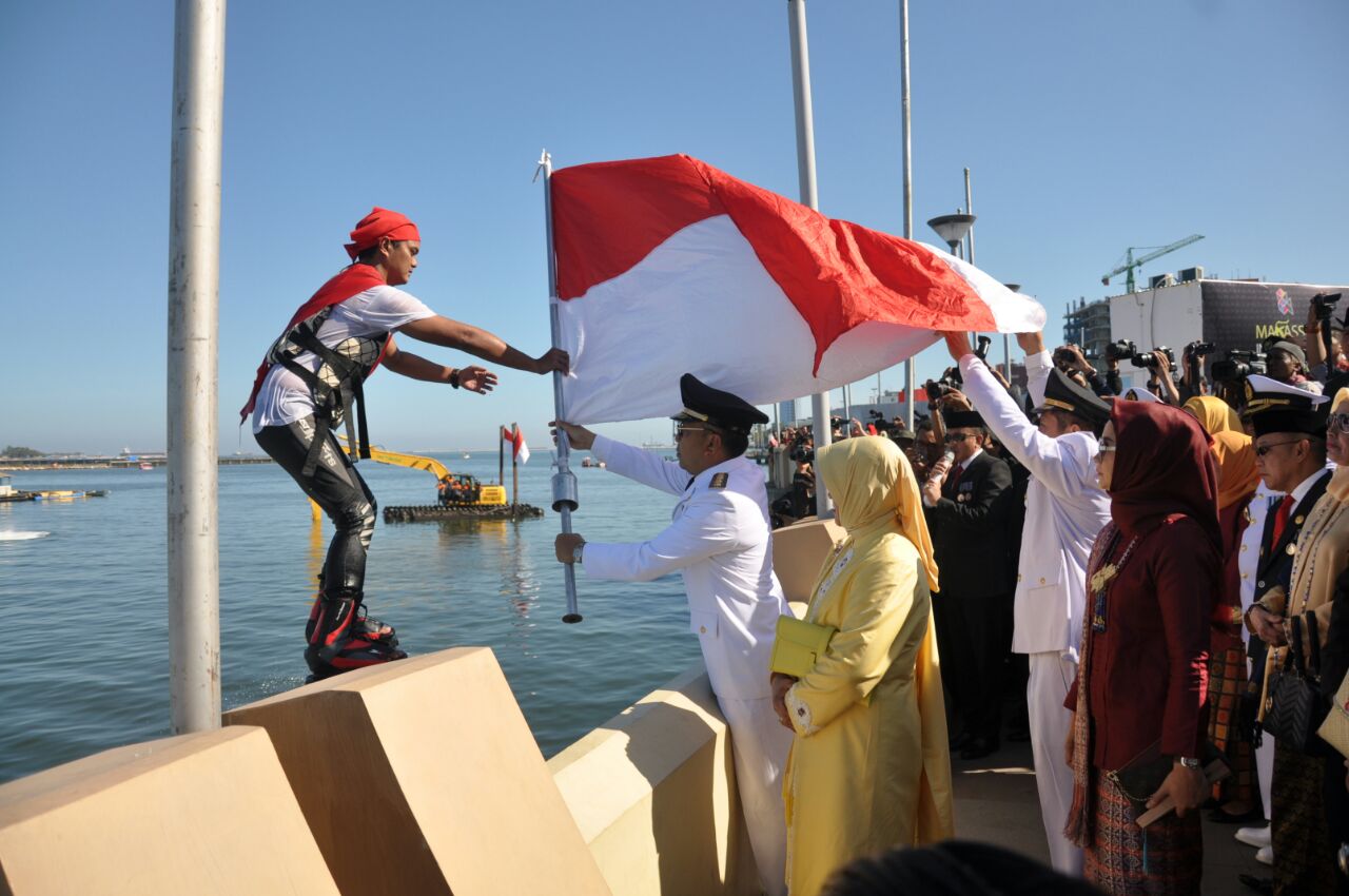 Dinas Kelautan Pertanian Perikanan dan Peternakan Kota Makassar memeriahkan peringatan hari ulang tahun kemerdekaan Republik Indonesia, lewat pengibaran bendera merah putih di perairan Pantai Losari, Rabu (17/8) pagi. Pengibaran bendera terbilang unik, karena untuk pertama kalinya dilakukan dengan atraksi atlet Flyboard Persatuan Olahraga Perahu Motor dan Ski Air (Popsa).