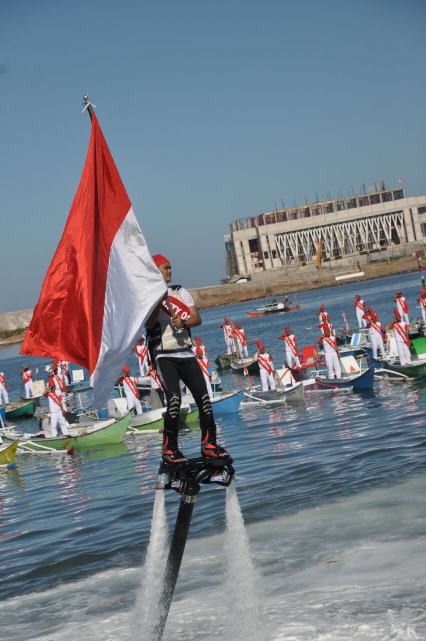 Delapan bendera merah-putih dikibarkan lewat tiang yang terapung di atas air. Usai pengibaran bendera, masyarakat yang memenuhi kawasan Pantai Losari dimanjakan oleh atraksi 71 kapal nelayan tradisional jolloro, yang mewakili 11 pulau di bawah kawasan kota Makassar. (NIA & ARI)