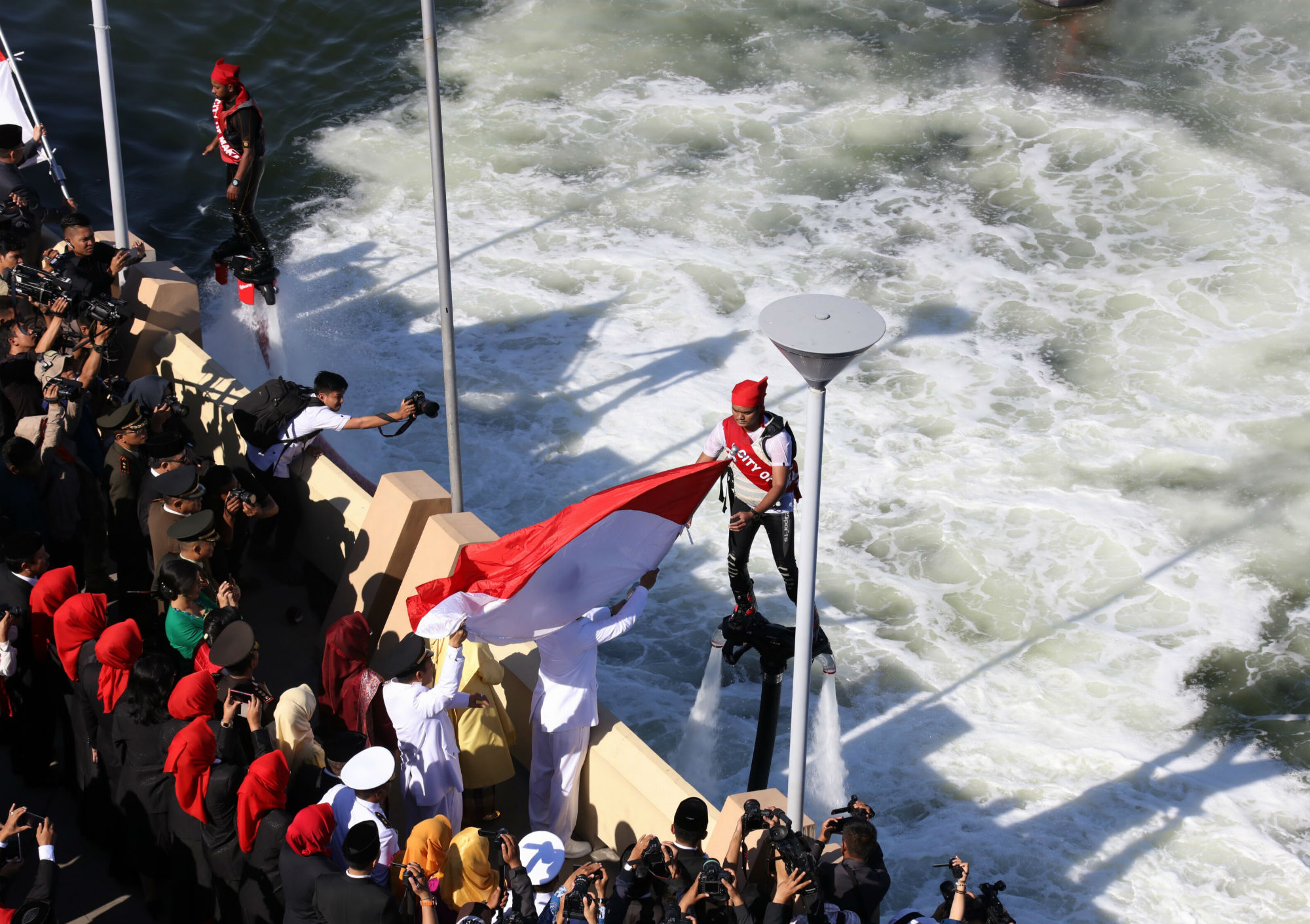 Delapan bendera merah-putih dikibarkan lewat tiang yang terapung di atas air. Usai pengibaran bendera, masyarakat yang memenuhi kawasan Pantai Losari dimanjakan oleh atraksi 71 kapal nelayan tradisional jolloro, yang mewakili 11 pulau di bawah kawasan kota Makassar. (NIA & ARI)
