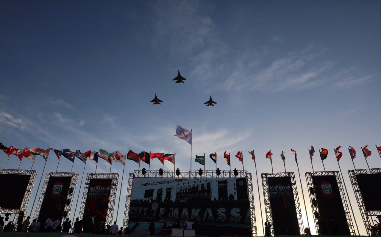 Atraksi udara pesawat TNI Angkatan Udara memukau pengunjung festival F8 di Anjungan Pantai Losari Makassar, Rabu petang (6/9). Atraksi yang melibatkan dua tim pesawat jet Sukhoi dan pesawat aerobatic Jupiter berlangsung selama 15 menit. Aksi ini menandai dimulainya F8 yang merupakan kolaborasi pertunjukan seni dan budaya Makassar. (ARI)