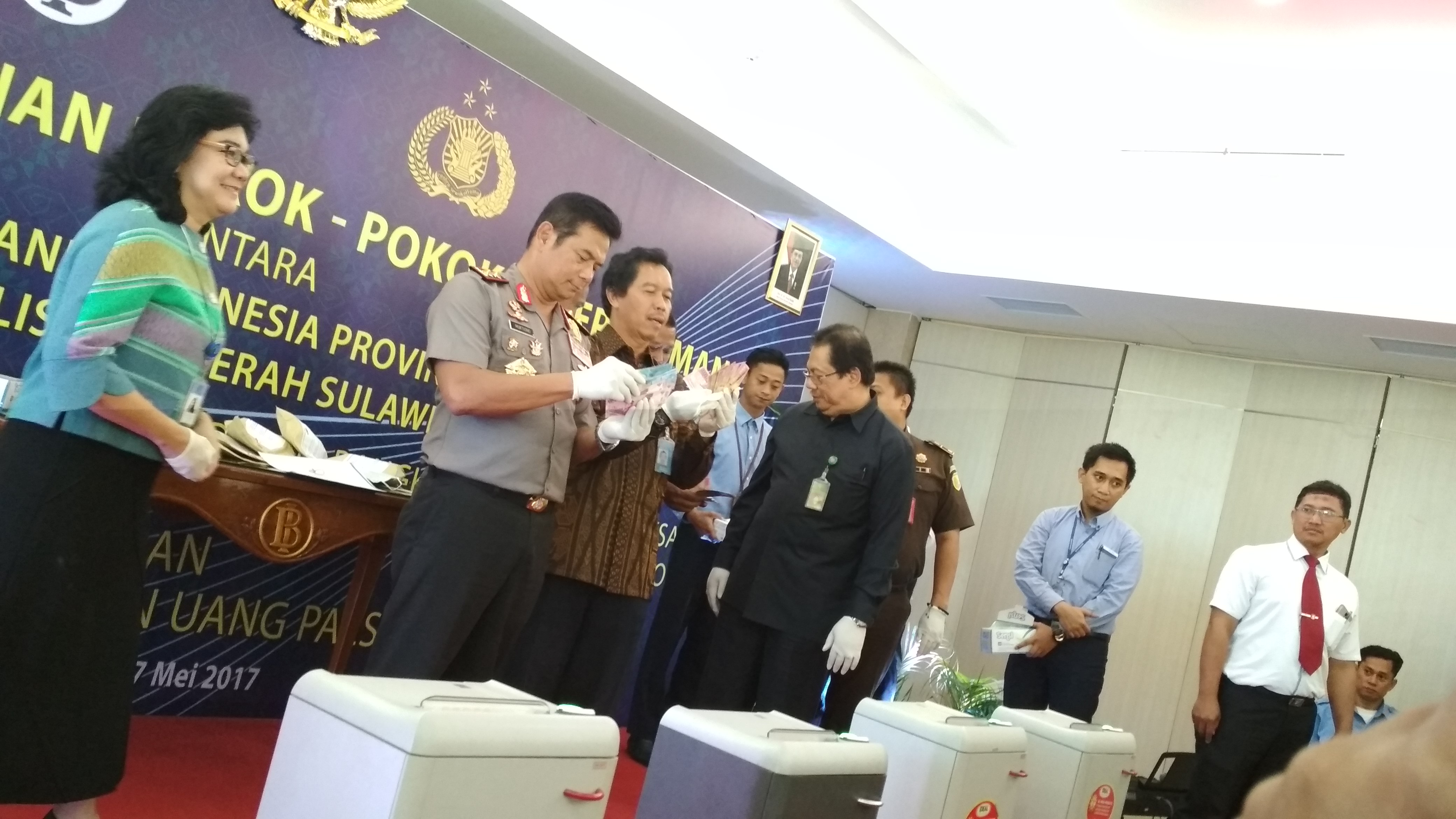 Bank Indonesia bersama Kepolisian Daerah Sulawesi Selatan memusnahkan lebih tiga ribu lembar uang palsu di Makassar, Rabu (17/5). Uang palsu merupakan temuan perbankan dari wilayah Sulsel dalam kurun waktu 2015-2016. (ARI)