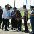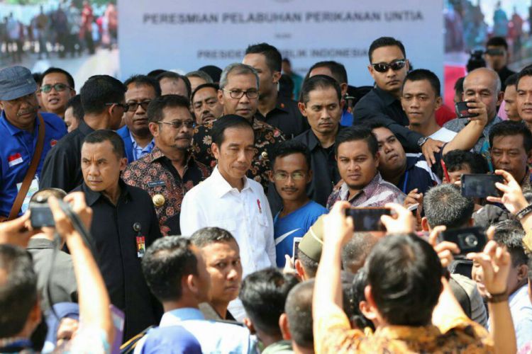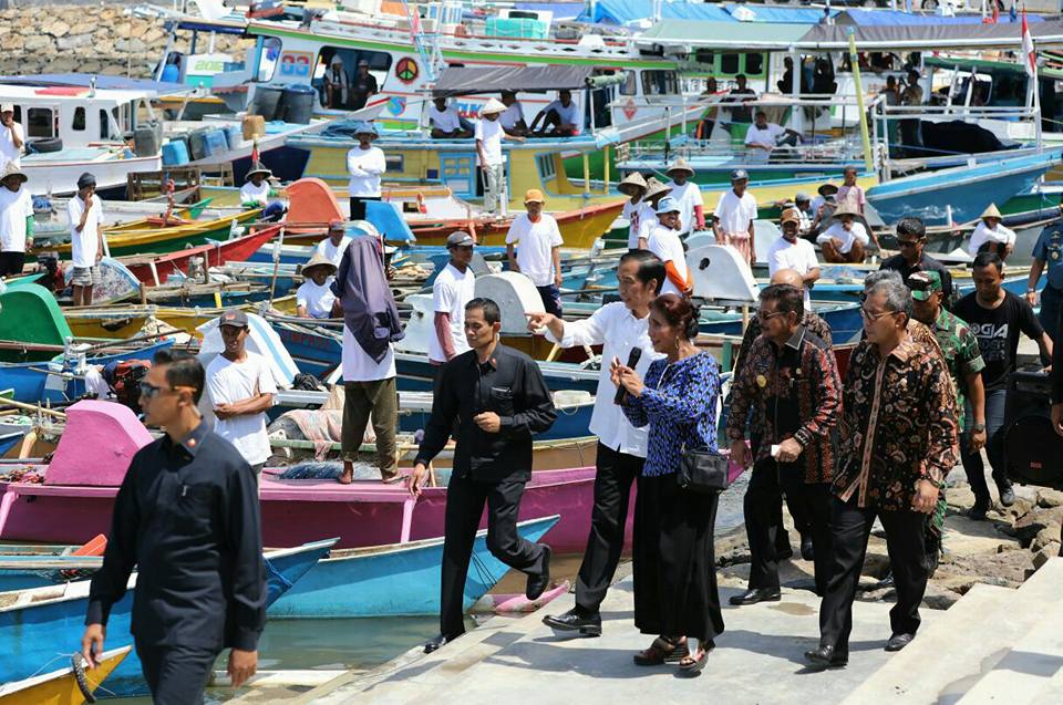 Wali Kota Makassar Danny Pomanto mendampingi Presiden Republik Indonesia Joko Widodo saat meresmikan penggunaan Pelabuhan Perikanan Nusantara di kelurahan Untia, kecamatan Biringkanaya Makassar, Sabtu (26/11). Pelabuhan diharapkan sebagai salah satu sentra distribusi hasil kekayaan laut di Indonesia timur. Di kesempatan yang sama, Menteri Kelautan dan Perikanan Susi Pudjiastuti juga membagikan kartu asuransi bagi perwakilan nelayan. (ARI)