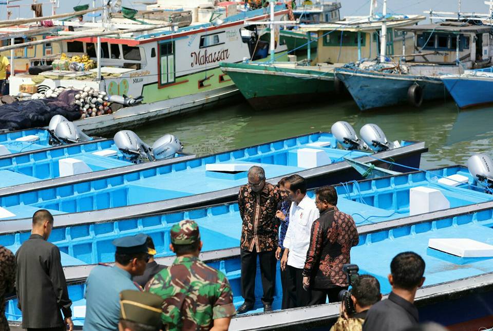 Wali Kota Makassar Danny Pomanto mendampingi Presiden Republik Indonesia Joko Widodo saat meresmikan penggunaan Pelabuhan Perikanan Nusantara di kelurahan Untia, kecamatan Biringkanaya Makassar, Sabtu (26/11). Pelabuhan diharapkan sebagai salah satu sentra distribusi hasil kekayaan laut di Indonesia timur. Di kesempatan yang sama, Menteri Kelautan dan Perikanan Susi Pudjiastuti juga membagikan kartu asuransi bagi perwakilan nelayan. (ARI)