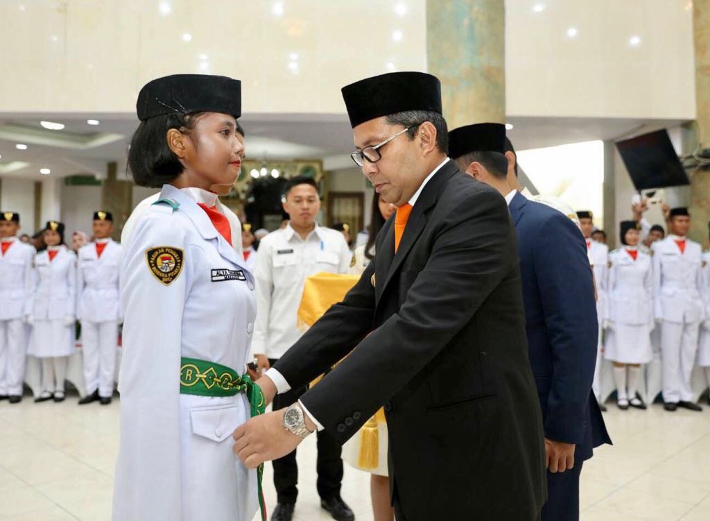 Wali Kota Makassar Danny Pomanto mengukuhkan 70 anggota Pasukan Pengibar Bendera (Paskibra) di Rumah Jabatan Wali Kota, jalan Penghibur Makassar, Rabu (16/8). Paskibra akan bertugas mengibarkan bendera merah-putih pada upacara peringatan Hari Ulang Tahun Republik Indonesia ke-72 di Lapangan Karebosi, 17 Agustus besok. Anggota Paskibra Makassar dipilih dari berbagai sekolah menengah atas di Makassar. (ARI)