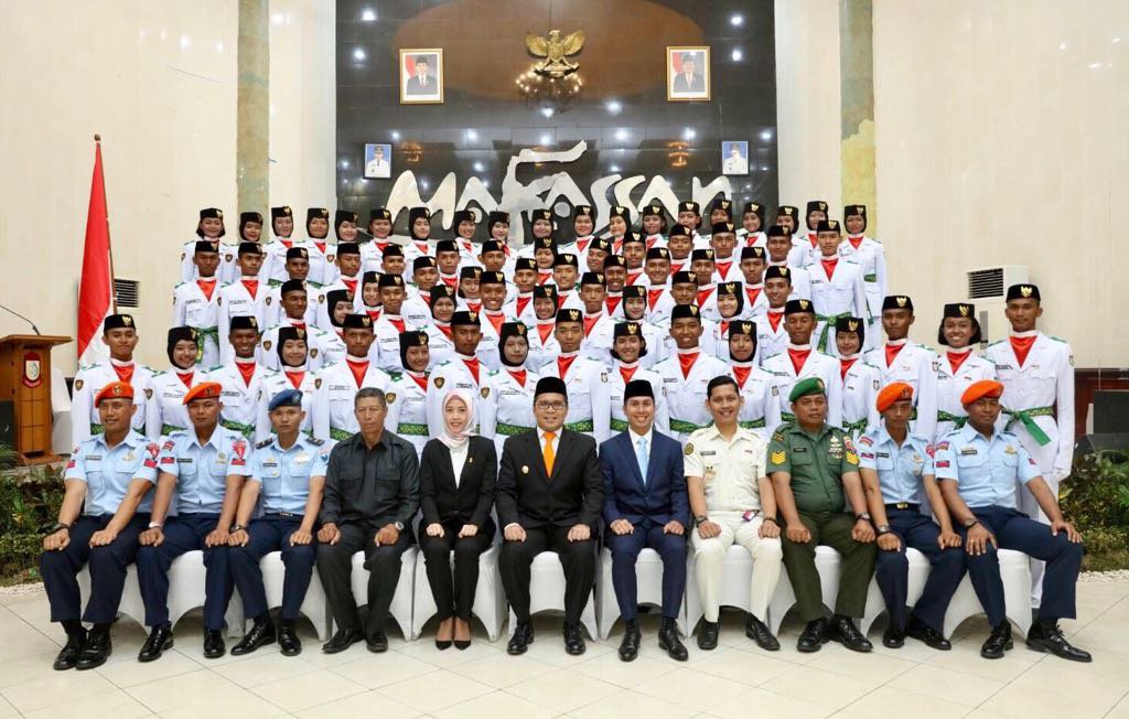 Wali Kota Makassar Danny Pomanto mengukuhkan 70 anggota Pasukan Pengibar Bendera (Paskibra) di Rumah Jabatan Wali Kota, jalan Penghibur Makassar, Rabu (16/8). Paskibra akan bertugas mengibarkan bendera merah-putih pada upacara peringatan Hari Ulang Tahun Republik Indonesia ke-72 di Lapangan Karebosi, 17 Agustus besok. Anggota Paskibra Makassar dipilih dari berbagai sekolah menengah atas di Makassar. (ARI)