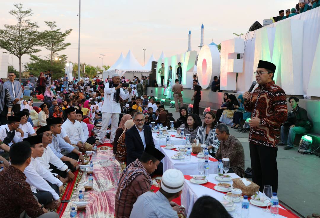 Duta Besar Inggris untuk Indonesia Moazzam Malik memenuhi undangan Wali Kota Makassar Danny Pomanto, berbuka puasa dengan ribuan anak yatim dan kaum dhuafa di Anjungan Pantai Losari Makassar, Sulsel, Jumat (16/6). Buka puasa bersama kaum dhuafa merupakan jadwal rutin Pemkot Makassar yang digelar setiap hari Jumat pada bulan Ramadan. Adapun Malik berada di Makassar dalam rangkaian kunjungan kerjanya di Sulsel. (ARI)