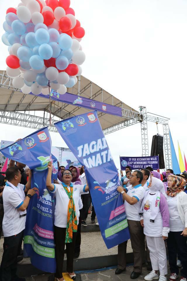 Wali Kota Makassar Mohammad Ramdhan Pomanto bersama wakilnya Syamsu Rizal mendampingi Menteri Pemberdayaan Perempuan dan Perlindungan Anak (PPPA) Yohana S. Yambise pada rangkaian puncak Jelajah 3ENDS di Pantai Losari Kota Makassar, Minggu (23/4). Pemkot Makassar menyatakan menyambut baik program 3ENDS dan berupaya menjunjung tinggi pemenuhan hak perempuan dan anak.