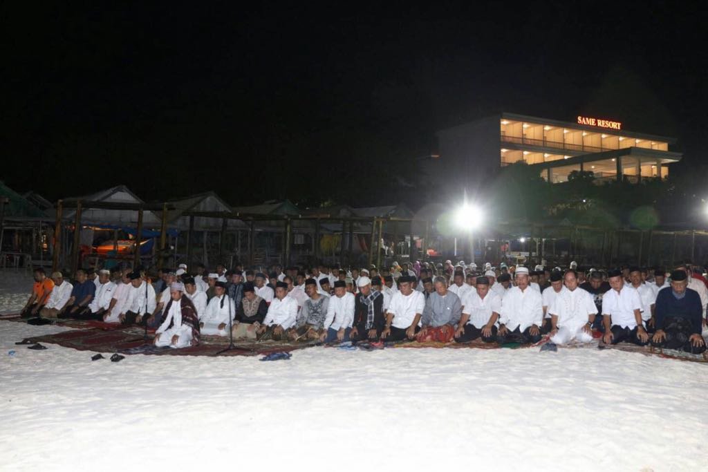 Ratusan pejabat dan staf Pemerintah Kota Makassar yang mengikuti program outbond, menjalankan ibadah salat subuh berjamaah di Pantai Bira kabupaten Bulukumba, Kamis (21/9). Ibadah juga bertepatan dengan tahun baru Islam 1439 Hijriah, sehingga diharapkan dimaknai sebagai perpindahan atau hijrah ke arah yang lebih baik. (ARI)