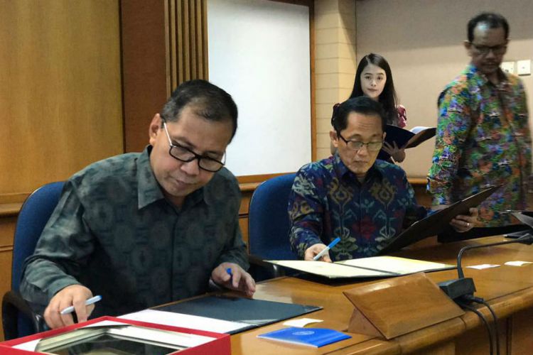 Wali Kota Mohammad Ramdhan Pomanto mewakili Pemerintah Kota Makassar menandatangani nota kesepahaman (MoU) bersama Rektor Institut Teknologi Bandung, di Gedung CCAR ITB kota Bandung, Jawa Barat, Senin (13/6). MoU tersebut menyangkut kerja sama kedua pihak dalam hal kajian penyediaan air bersih dan perencanaan berbasis kelitbangan. (ARI)
