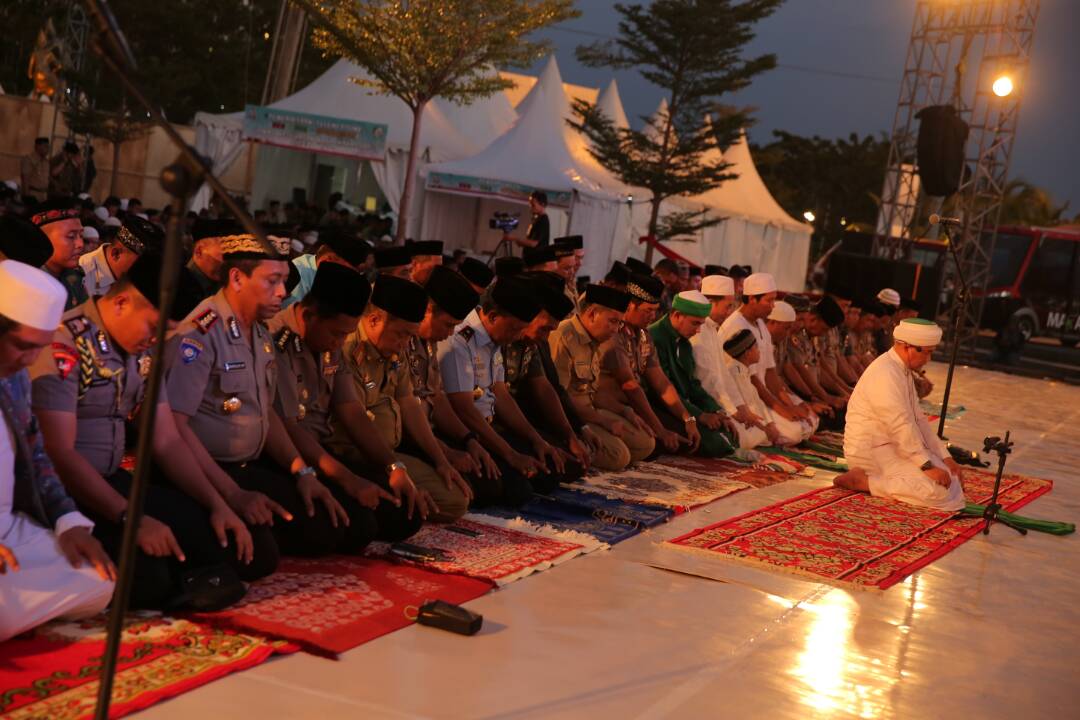 Pemerintah Kota Makassar bersama jajaran TNI-Polri dan masyarakat umum menggelar shalat magrib dan zikir bersama di Anjungan Pantai Losari Makassar, Selasa (23/5). Kegiatan digelar di tengah pelaksanaan Makassar City Expo, pameran inovasi pemerintahan tiga tahun terakhir. Zikir sekaligus dalam rangka menyambut bulan suci Ramadhan. (ARI)
