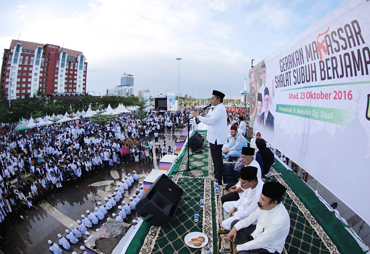 Ribuan santri dan pemerhati pesantren se- Sulawesi Selatan turut meramaikan Gerakan Shalat Subuh Berjamaah di Anjungan Pantai Losari Makassar, Minggu (23/10). Gerakan yang rutin digelar Pemerintah Kota Makassar setiap bulan, kali ini dirangkaikan dengan peringatan Hari Santri Nasional 2016.