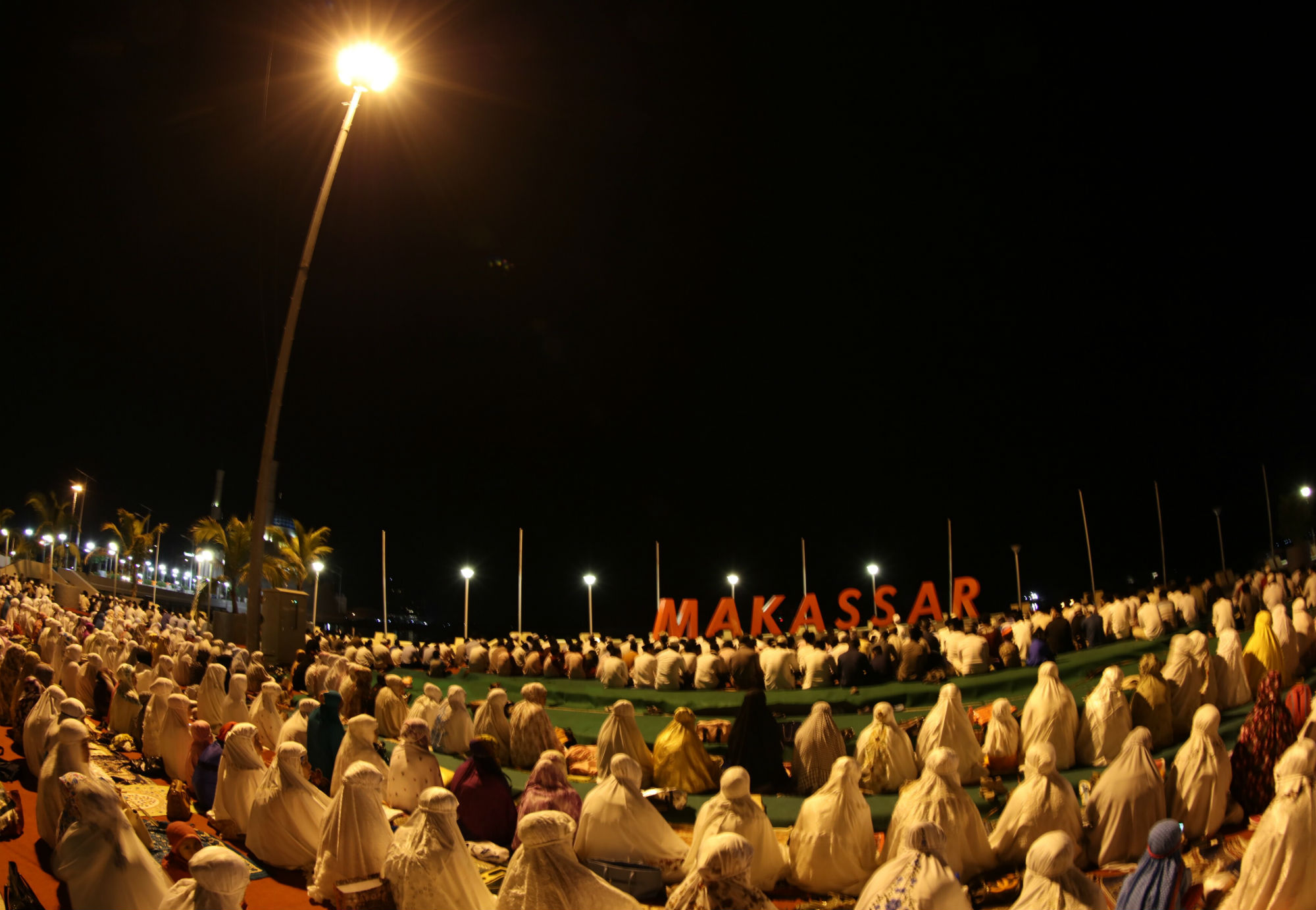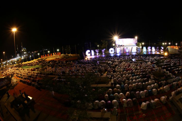 Ribuan warga kota Makassar tumpah ruah menjalankan ibadah salat subuh di Anjungan Pantai Losari, Minggu (28/8). Gerakan Salat Subuh Berjemaah merupakan agenda rutin bulanan Pemerintah Kota Makassar yang digelar setiap hari Minggu di pekan terakhir. Ibadah ini diikuti berbagai lapisan masyarakat, PNS, serta aparat TNI-Polri. (Ari)