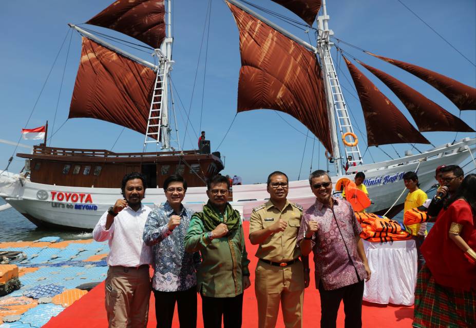 PT Toyota-Astra Motor (TAM) melalui program corporate social responsibility (CSR) berbasis lingkungan meresmikan program Pinisi Bagi Negeri, di Pantai Losari Makassar, Jumat (21/4). Satu unit kapal layar phinisi senilai Rp1 Miliar disumbangkan untuk digunakan siswa sekolah maupun masyarakat untuk berlayar di sekitar pulau Samalona, di perairan Makassar. Diharapkan, program ini meningkatkan pengetahuan masyarakat tentang budaya maritim dan kepedulian lingkungan bawah laut. (ARI)