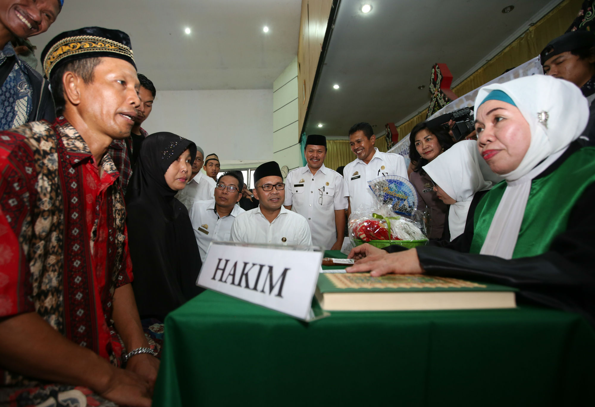 Wali Kota Makassar Mohammad Ramdhan ‘Danny’ Pomanto menjadi saksi sidang isbat nikah di Aula SMKN 5 Makassar, Rabu (3/8). Sidang diikuti 300 pasangan yang akan menjadi peserta nikah ulang secara massal di Pantai Losari, 6 Agustus. Sidang ini merupakan prosedur bagi setiap pasangan mendapatkan buku nikah, karena sebelumnya menikah berdasarkan hukum agama tanpa terdaftar di pemerintah secara sah. (Ari)