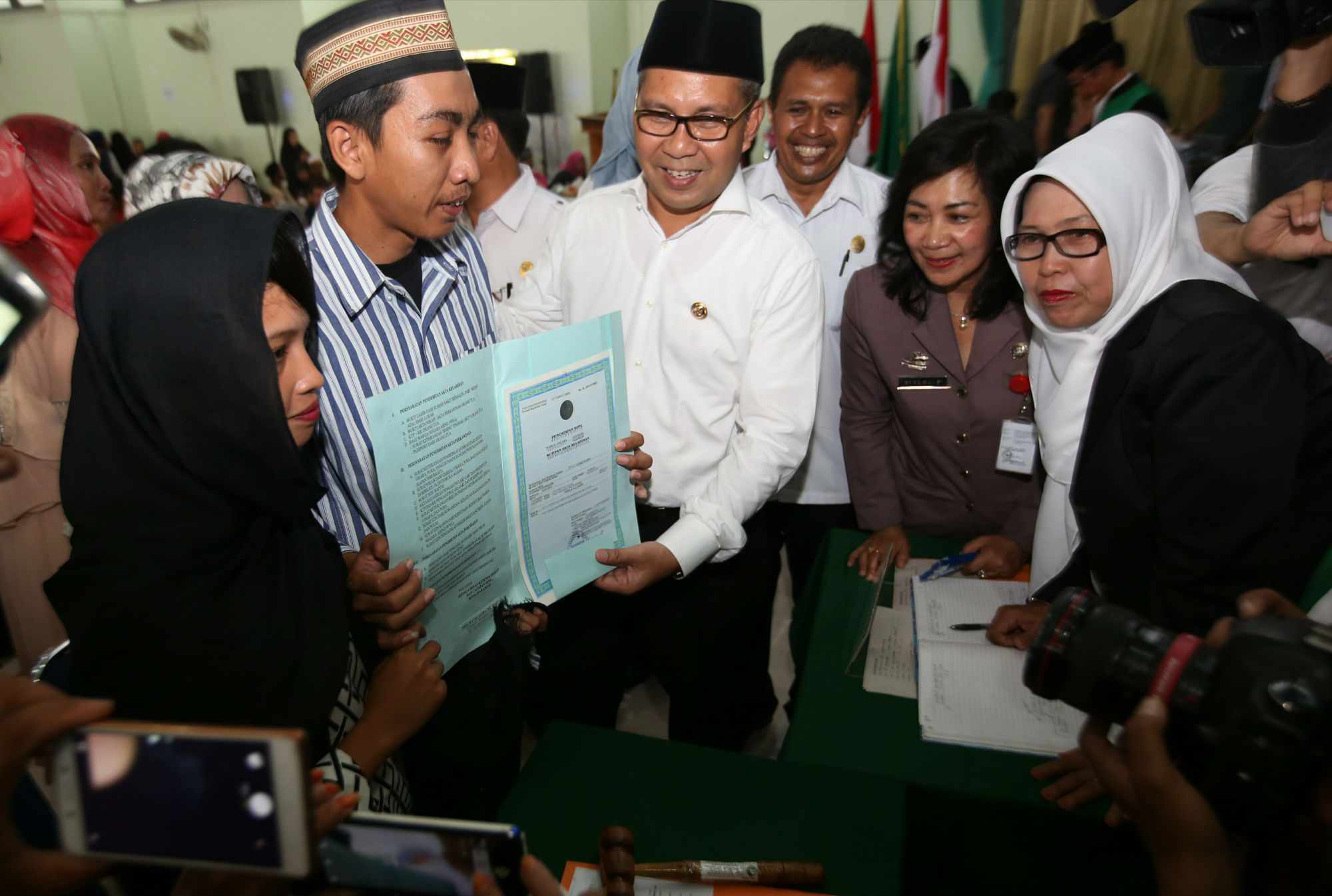 Wali Kota Makassar Mohammad Ramdhan ‘Danny’ Pomanto menjadi saksi sidang isbat nikah di Aula SMKN 5 Makassar, Rabu (3/8). Sidang diikuti 300 pasangan yang akan menjadi peserta nikah ulang secara massal di Pantai Losari, 6 Agustus. Sidang ini merupakan prosedur bagi setiap pasangan mendapatkan buku nikah, karena sebelumnya menikah berdasarkan hukum agama tanpa terdaftar di pemerintah secara sah. (Ari)