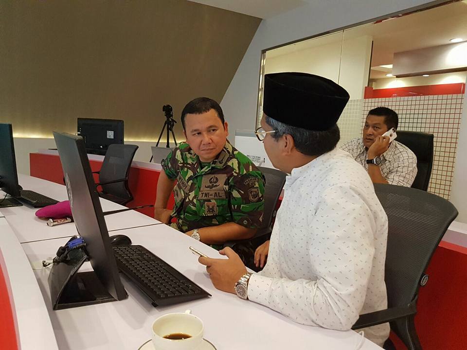 Wali kota Makassar Mohammad Ramdhan Pomanto bersama Komandan Batalion Marinir Pertahanan Pangkalan Utama TNI Angkatan Laut (Lantamal) VI Letkol Marinir Wempy, memantau Aksi 4 November melalui War Room di Balai Kota Makassar, Jumat (4/11). Mereka mengamati perkembangan terkini suasana kota melalui layar besar yang terintegrasi dengan puluhan kamera pengintai di berbagai titik strategis. Aksi demonstrasi di Makassar dengan agenda utama menuntut proses hukum terhadap Basuki Tjahaja Kumala atau Ahok berjalan dengan damai dan tertib. (ARI)