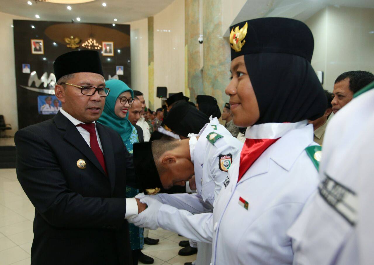 Wali Kota Makassar Mohammad Ramdhan Pomanto mengukuhkan 70 anggota Pasukan Pengibar Bendera Pusaka 2016 tingkat Kota Makassar, di Baruga Anging Mammiri, Senin (15/8). Mereka akan bertugas pada upacara peringatan hari ulang tahun kemerdekaan Republik Indonesia ke-71, di Lapangan Karebosi Makassar, Selasa 17 Agustus 2016. Mereka sebelumnya diseleksi dari berbagai SMA dan mendapatkan serangkaian pelatihan. (ARI)