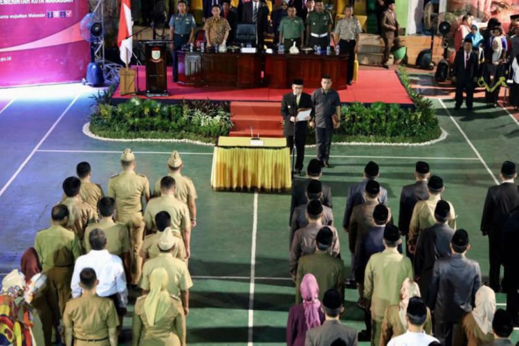 Wali Kota Makassar Danny Pomanto melantik pejabat lingkup Pemerintah Kota di halaman SMP Negeri 5, jalan Sumba Makassar, Jumat malam (11/8). Pada pelantikan tersebut diambil sumpah terhadap 215 orang pejabat eselon lll dan IV antara lain direksi, badan/dewan pengawas perusahaan daerah, jabatan administrator, serta jabatan pengawas dan lurah dalam lingkup Satuan Kerja Perangkat Daerah (SKPD). (ARI)