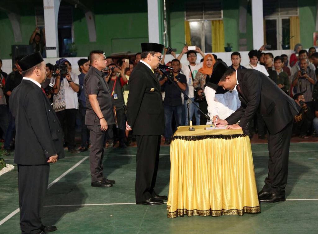 Wali Kota Makassar Danny Pomanto melantik pejabat lingkup Pemerintah Kota di halaman SMP Negeri 5, jalan Sumba Makassar, Jumat malam (11/8). Pada pelantikan tersebut diambil sumpah terhadap 215 orang pejabat eselon lll dan IV antara lain direksi, badan/dewan pengawas perusahaan daerah, jabatan administrator, serta jabatan pengawas dan lurah dalam lingkup Satuan Kerja Perangkat Daerah (SKPD). (ARI)