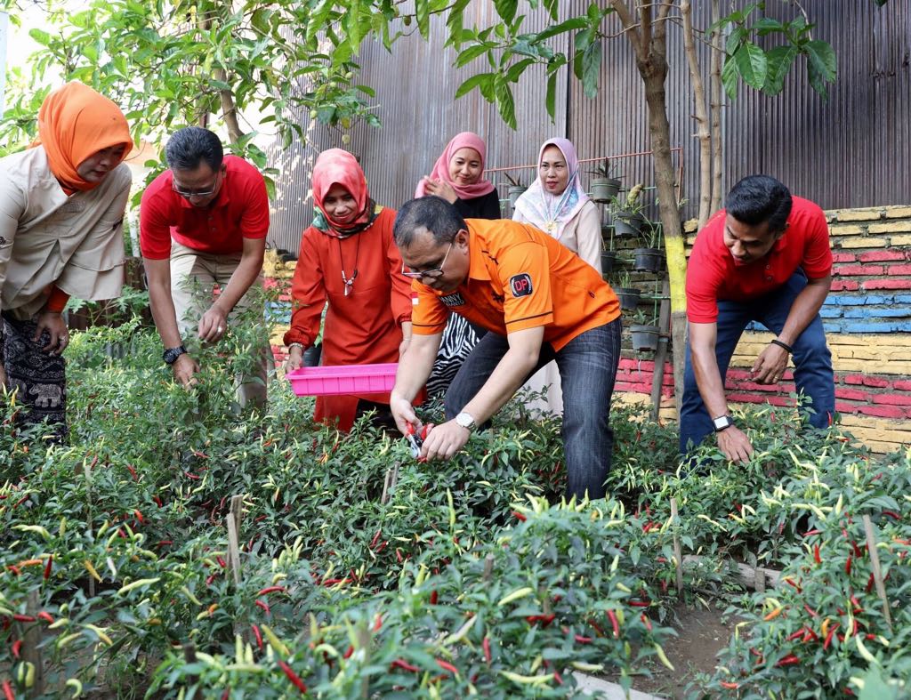 Wali Kota Makassar Danny Pomanto memimpin panen cabai di kawasan Cappoa kelurahan Pannampu, kecamatan Tallo, Sabtu (15/7). Sekitar 10 kilogram cabai merah dipetik untuk dijual ke pasaran. Kawasan tersebut merupakan salah satu dari 700 Badan Usaha Lorong ( BULo) di Makassar, yang dikembangkan masyarakat secara swadaya menggunakan lahan kosong di lorong-lorong sejak tahun lalu. (ARI)