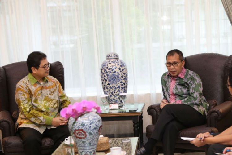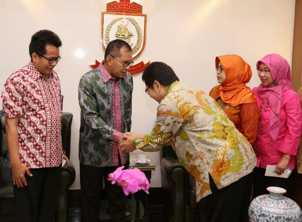 Wali Kota Makassar Mohammad Ramdhan Pomanto menerima kunjungan Sekretaris Kementerian Pemberdayaan Perempuan dan Perlindungan Anak Wahyu Hartoyo di rumah jabatan wali kota, jalan Penghibur Makassar, Kamis (30/3). Wahyu dan rombongan berkunjung dalam rangka persiapan ajang Jelajah Three Ends di Makassar.
