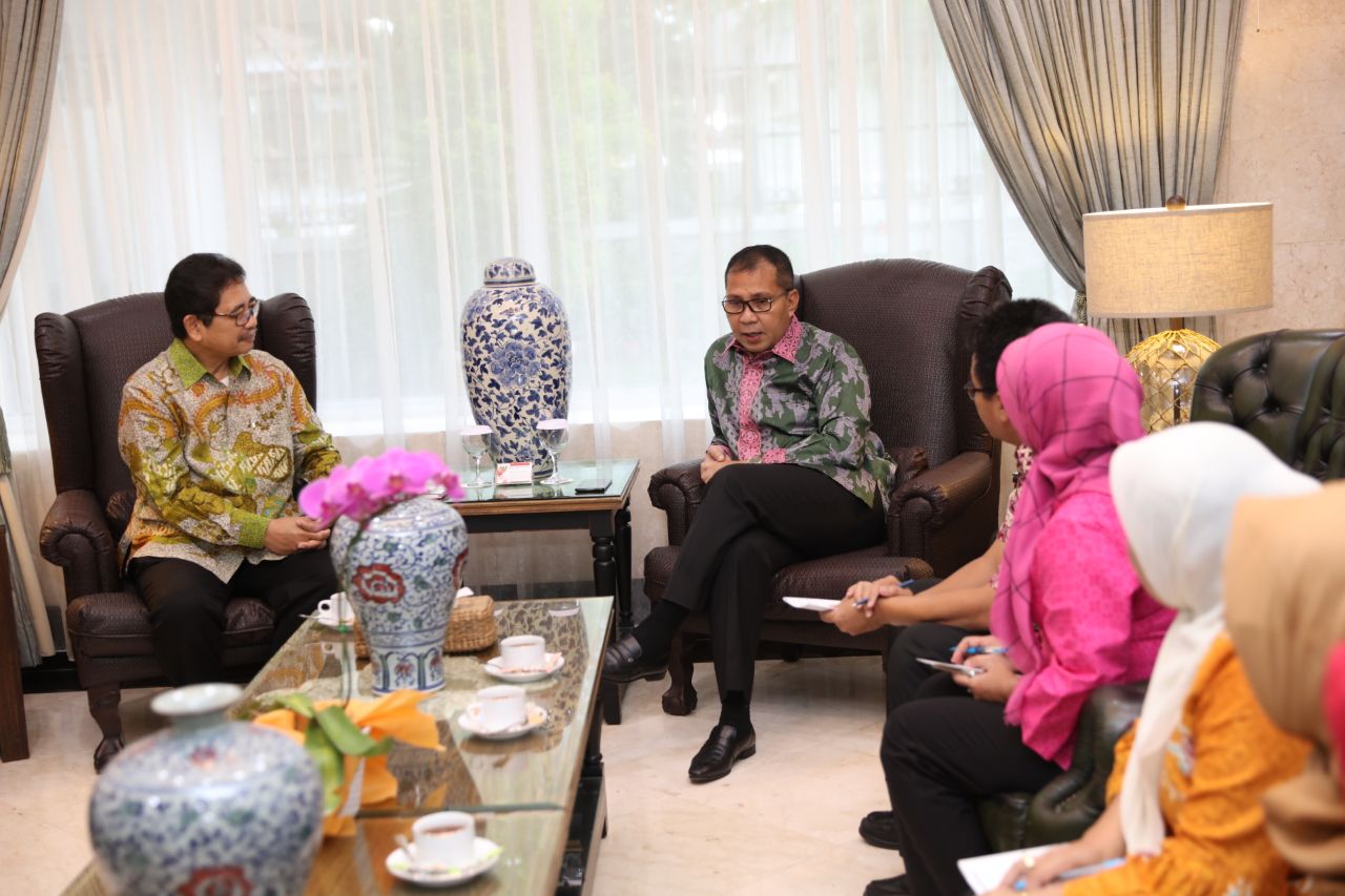 Wali Kota Makassar Mohammad Ramdhan Pomanto menerima kunjungan Sekretaris Kementerian Pemberdayaan Perempuan dan Perlindungan Anak Wahyu Hartoyo di rumah jabatan wali kota, jalan Penghibur Makassar, Kamis (30/3). Wahyu dan rombongan berkunjung dalam rangka persiapan ajang Jelajah Three Ends di Makassar.