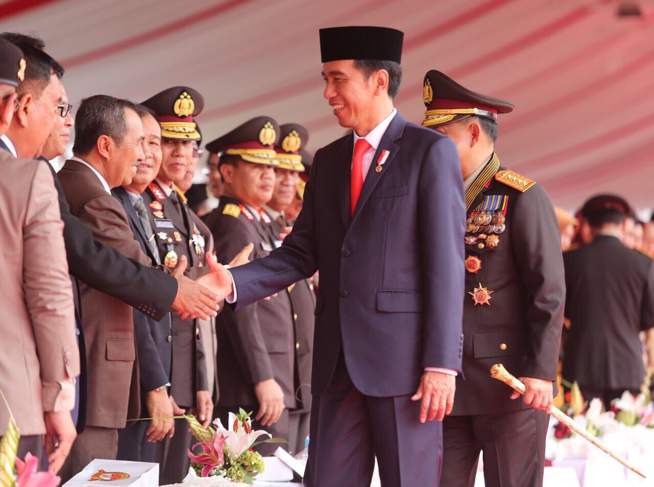 Wali Kota Makassar Danny Pomanto menerima penghargaan dari Kepala Kepolisian Republik Indonesia Jenderal Tito Karnavian, pada upacara dan syukuran HUT Bhayangkara ke-71, di Lapangan Silang Monas Jakarta Pusat, Senin (10/7). Penghargaan diberikan atas keberhasilan Danny membangun sistem keamanan kota dengan kamera CCTV yang dikontrol langsung melalui war room. Sistem ini telah terintegrasi dengan mini war room yang ada di Polrestabes Makassar dan beroperasi sejak tahun 2016. (ARI)
