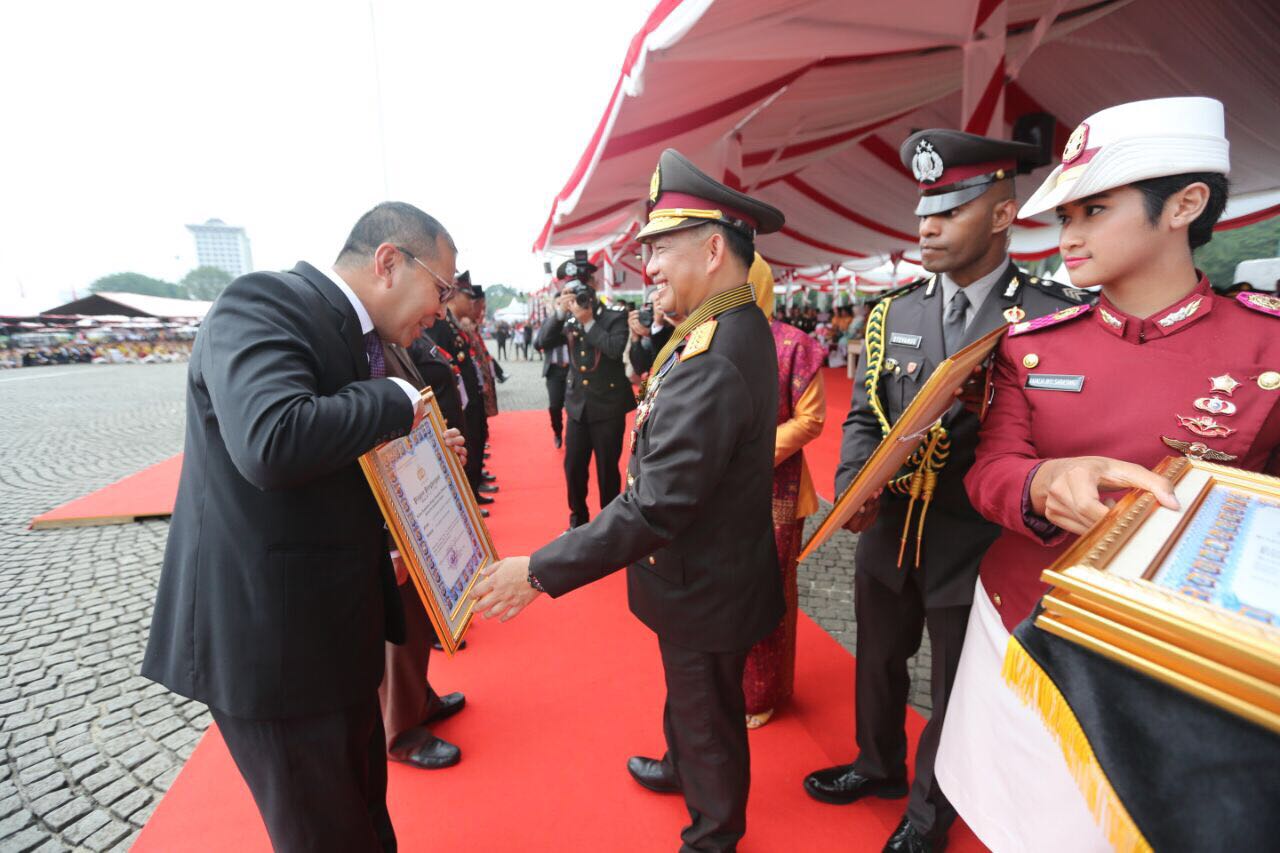 Wali Kota Makassar Danny Pomanto menerima penghargaan dari Kepala Kepolisian Republik Indonesia Jenderal Tito Karnavian, pada upacara dan syukuran HUT Bhayangkara ke-71, di Lapangan Silang Monas Jakarta Pusat, Senin (10/7). Penghargaan diberikan atas keberhasilan Danny membangun sistem keamanan kota dengan kamera CCTV yang dikontrol langsung melalui war room. Sistem ini telah terintegrasi dengan mini war room yang ada di Polrestabes Makassar dan beroperasi sejak tahun 2016. (ARI)