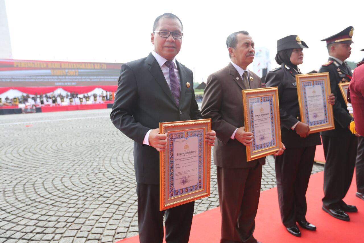 Wali Kota Makassar Danny Pomanto menerima penghargaan dari Kepala Kepolisian Republik Indonesia Jenderal Tito Karnavian, pada upacara dan syukuran HUT Bhayangkara ke-71, di Lapangan Silang Monas Jakarta Pusat, Senin (10/7). Penghargaan diberikan atas keberhasilan Danny membangun sistem keamanan kota dengan kamera CCTV yang dikontrol langsung melalui war room. Sistem ini telah terintegrasi dengan mini war room yang ada di Polrestabes Makassar dan beroperasi sejak tahun 2016. (ARI)