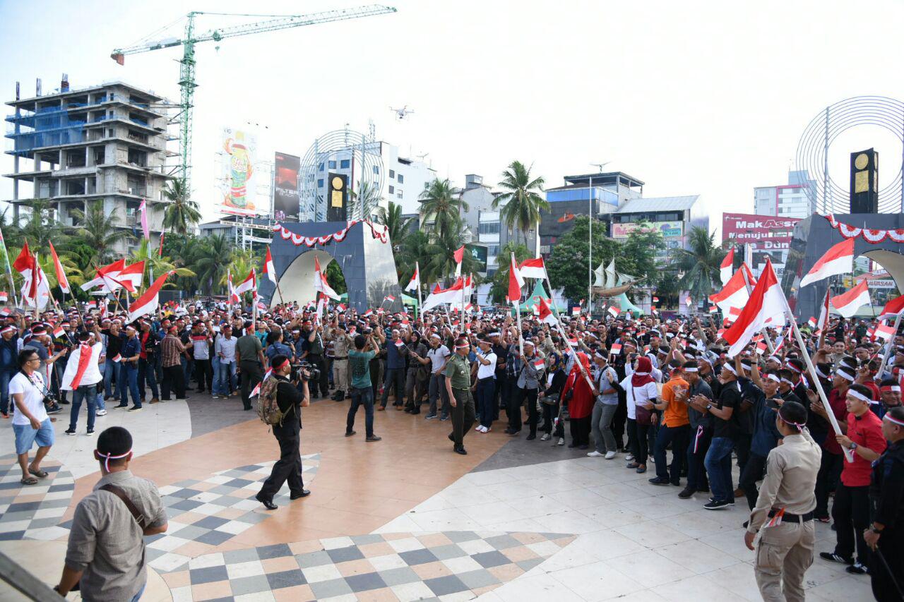 Ribuan orang dari berbagai elemen masyarakat bergabung dalam aksi Deklarasi Nusantara Bersatu yang digelar di Anjungan Pantai Losari Makassar, Rabu (30/11). Aksi yang diisi dengan orasi kebangsaan serta pembacaan doa bersama menekankan pentingnya menjaga persatuan dan kesatuan bangsa. Aksi dipimpin sejumlah tokoh pimpinan dari unsur pemerintah daerah, Polisi, TNI, dan perwakilan Forum Kerukunan Umat Beragama. (ARI)