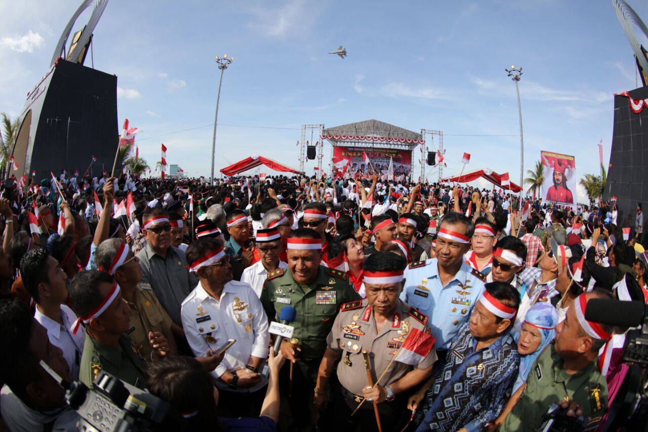 Ribuan orang dari berbagai elemen masyarakat bergabung dalam aksi Deklarasi Nusantara Bersatu yang digelar di Anjungan Pantai Losari Makassar, Rabu (30/11). Aksi yang diisi dengan orasi kebangsaan serta pembacaan doa bersama menekankan pentingnya menjaga persatuan dan kesatuan bangsa. Aksi dipimpin sejumlah tokoh pimpinan dari unsur pemerintah daerah, Polisi, TNI, dan perwakilan Forum Kerukunan Umat Beragama. (ARI)