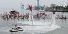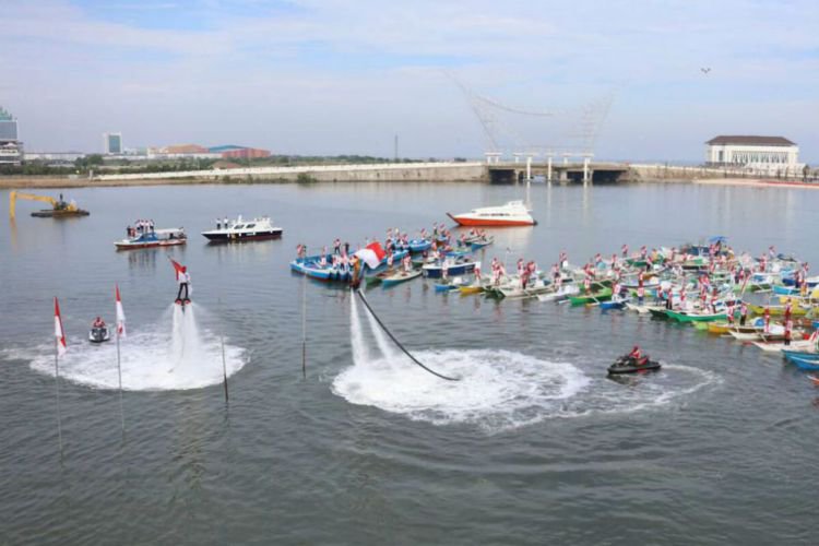 Merdeka.com, Makassar - Hari ulang tahun proklamasi kemerdekaan ke-72 Republik Indonesia diperingati dalam suasana berbeda di Makassar. Upacara bendera yang dipusatkan di Pantai Losari jalan Penghibur, Kamis (17/8) diisi dengan pengibaran bendera menggunakan atraksi fly board di atas air.