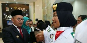 Dua Bendera yang telah terikat di sebatang bambu diserahkan oleh Wali Kota Danny Pomanto dan Wakil Ketua DPRD Makassar Indira Mulyasari kepada Audya dan Andi Rahmat.