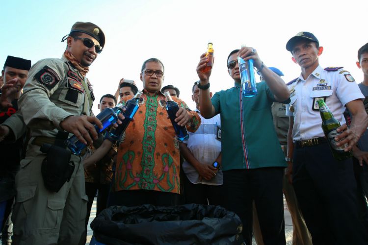 Wali kota Makassar Mohammad Ramdhan 'Danny' Pomanto memimpin pemusnahan 1.800 botol minuman keras (Miras) berbagai merek di pantai losari, Sabtu (18/6). Miras ini merupakan sitaan Satpol PP Kota Makassar dari berbagai tempat penjualan ilegal di berbagai titik di Makassar.
