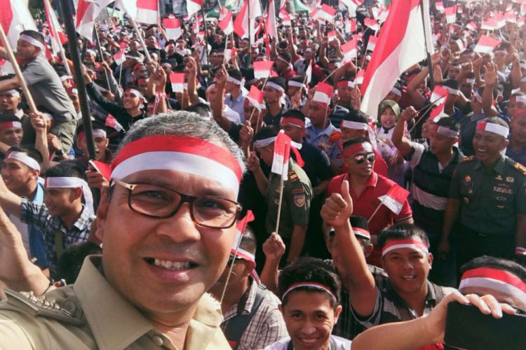 Massa yang hadir serentak mengenakan atribut ikat kepala merah-putih sembari mengibarkan bendera Indonesia dengan warna yang sama di tangan masing-masing. Mereka mengikuti serangkaian acara, seperti dialog, serta pembacaan doa bersama.