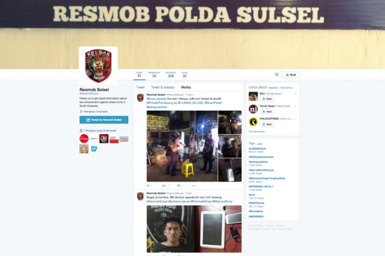Merdeka.com, Makassar - Kepolisian Daerah Sulawesi Selatan dan Barat berupaya membuka interaksi seluas mungkin dengan masyarakat. Kali ini dengan akses layanan pengaduan di media sosial, melalui akun Twitter Unit Reserse Mobil.