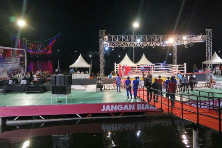 Ada hal menarik dalam perhelatan Muay Thai yang dilaksanakan di lokasi F8. Yakni ring yang dipasang terapung di atas laut Pantai Losari.