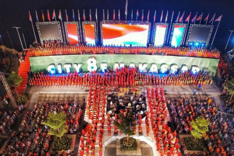 Merdeka.com, Makassar - Pertunjukan musik tradisional yang dibawakan oleh 1.700 siswa-siswi se-Makassar memukau ribuan penonton pada pembukaan acara Festival Internasional Eight Forum Makassar (F8), di pelataran Anjungan Pantai Losari Makassar, Rabu malam (6/9).